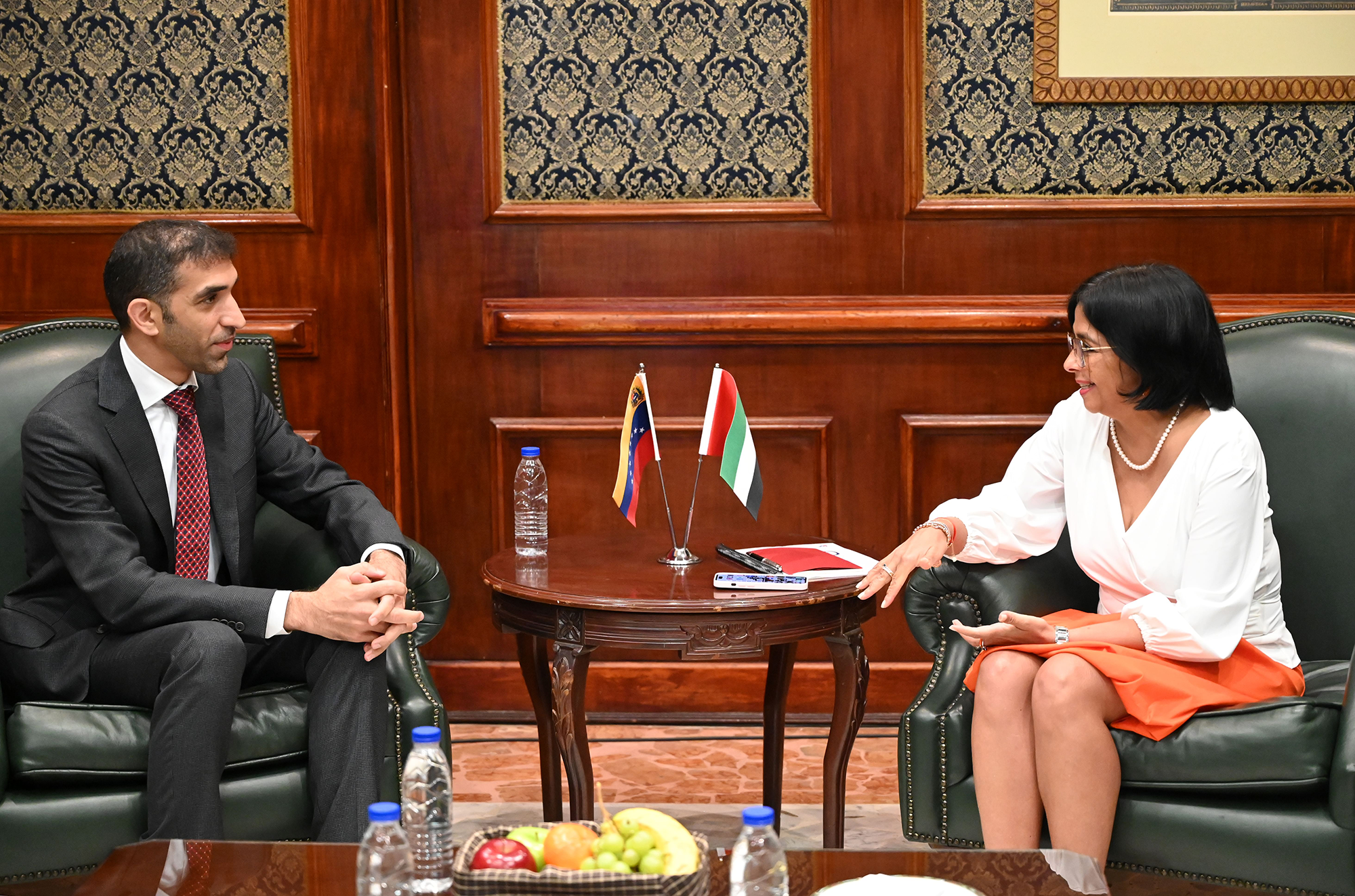 وخلال الزيارة استقبلت الدكتورة دلسي رودريغيس نائبة رئيس جمهورية فنزويلا البوليفارية الصديقة معالي الدكتور ثاني بن أحمد الزيودي وتطرقت المحادثات إلى العلاقات الثنائية بين دولة الإمارات وفنزويلا وسبل تعزيزها بما يخدم المصالح المشتركة للبدين الصديقين.