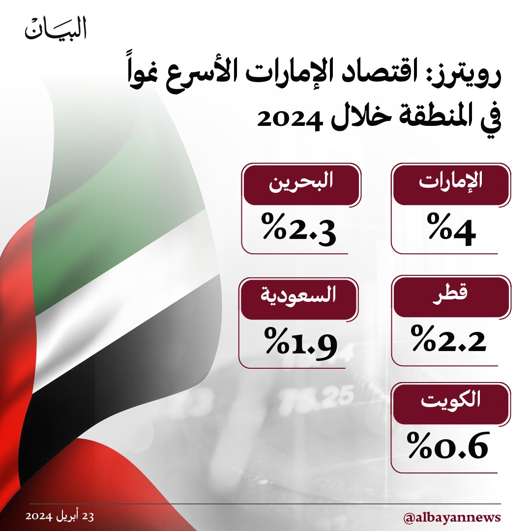 كشف استطلاع حديث أجرته رويترز أن اقتصاد الإمارات العربية المتحدة سينمو بأسرع وتيرة في المنطقة، ليظهر أداء قويا في القطاعات غير النفطية، بنسبة 4.0 بالمئة في 2024، ارتفاعاً من 3.8 بالمئة في استطلاع يناير.