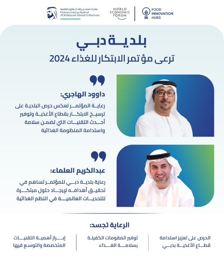 أعلنت بلدية دبي، عن رعايتها لمؤتمر الابتكار للغذاء 2024، الذي تُنظّمه مؤسسة "مبادرات محمد بن راشد آل مكتوم العالمية" بالتعاون مع المنتدى الاقتصادي العالمي، تحت شعار "إعادة تصور النظم الغذائية المستقبلية"، في الفترة من 13 إلى 15 مايو الجاري.