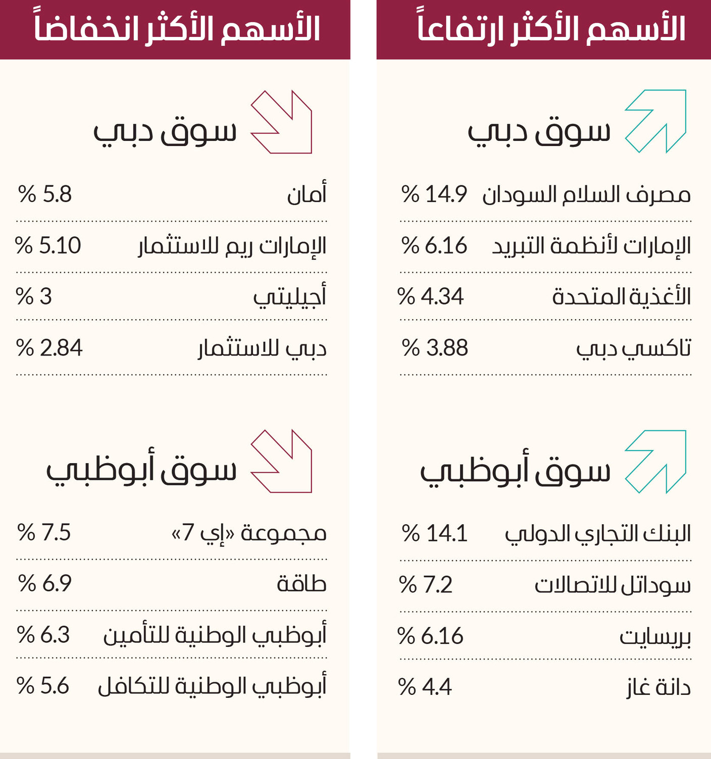 وكانت الأسهم الأكثر ارتفاعاً، مصرف السلام السودان بنسبة 14.9% والإمارات لأنظمة التبريد بنسبة 6.16% والأغذية المتحدة بنسبة 4.34% وتاكسي دبي بنسبة 3.88%. كما أقفل سهم إعمار العقارية مرتفعاً بنسبة 0.4% عند 8.23 دراهم، وبتداولات تجاوزت 8 ملايين سهم، بينما ارتفع سهم الاتحاد العقارية بنسبة 1.9% عند 0.369 درهم، وبتداولات تجاوزت 21 مليون سهم، كما ارتفع سهم دبي الإسلامي بنسبة 0.3% عند 5.76 دراهم، وبتداولات تجاوزت 6 ملايين سهم. فيما كانت الأسهم الأكثر انخفاضاً، أمان بنسبة 5.8% والإمارات ريم للاستثمار بنسبة 5.10% وأجيليتي بنسبة 3% ودبي للاستثمار بنسبة 2.84%.
