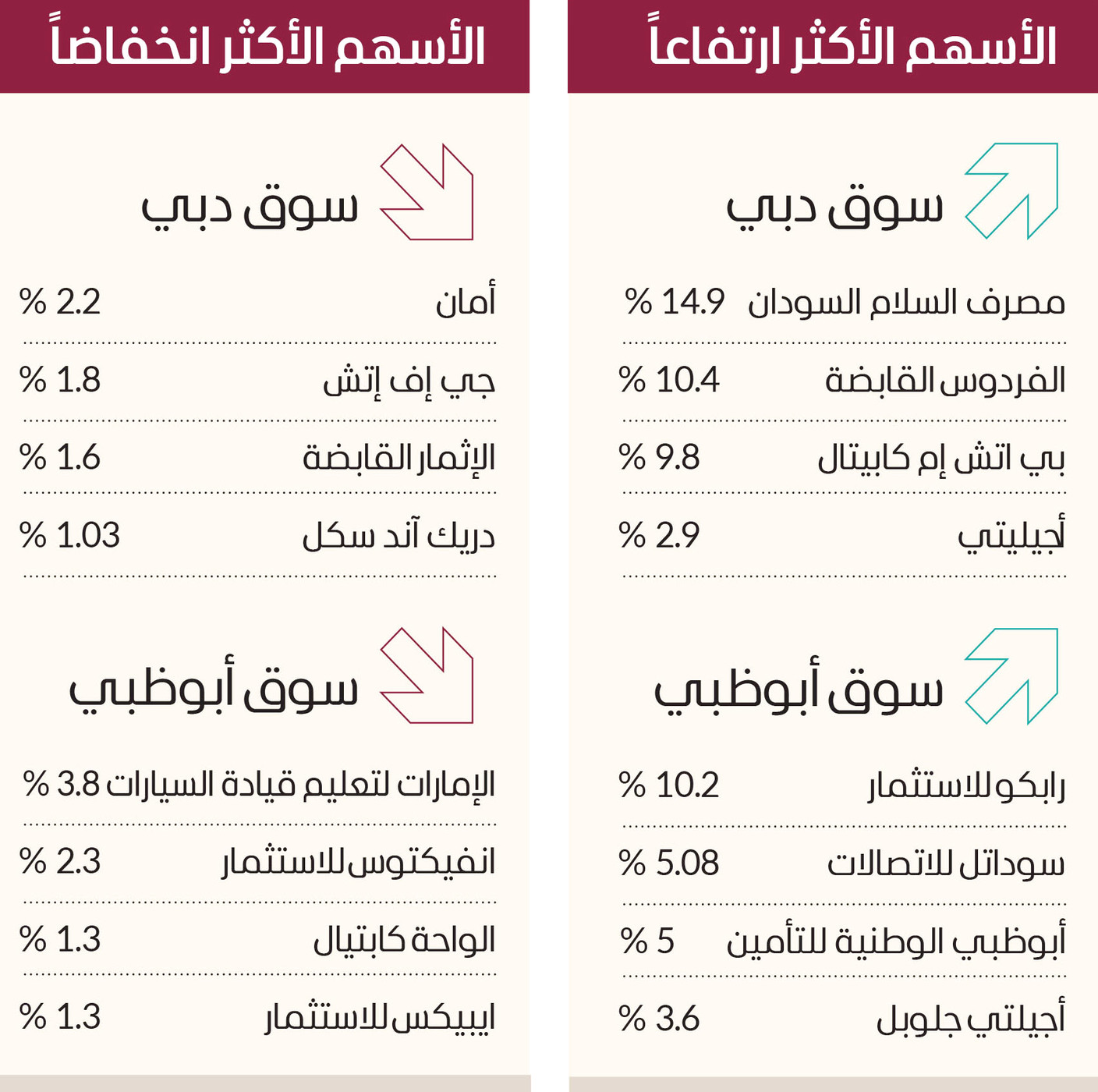 وتمثلت الأسهم الأكثر انخفاضاً في أسهم «أمان» بنسبة 2.2% و«جي إف إتش» بنسبة 1.8% و«الإثمار القابضة» بنسبة 1.6% و«دريك آند سكل» بنسبة 1.03%.