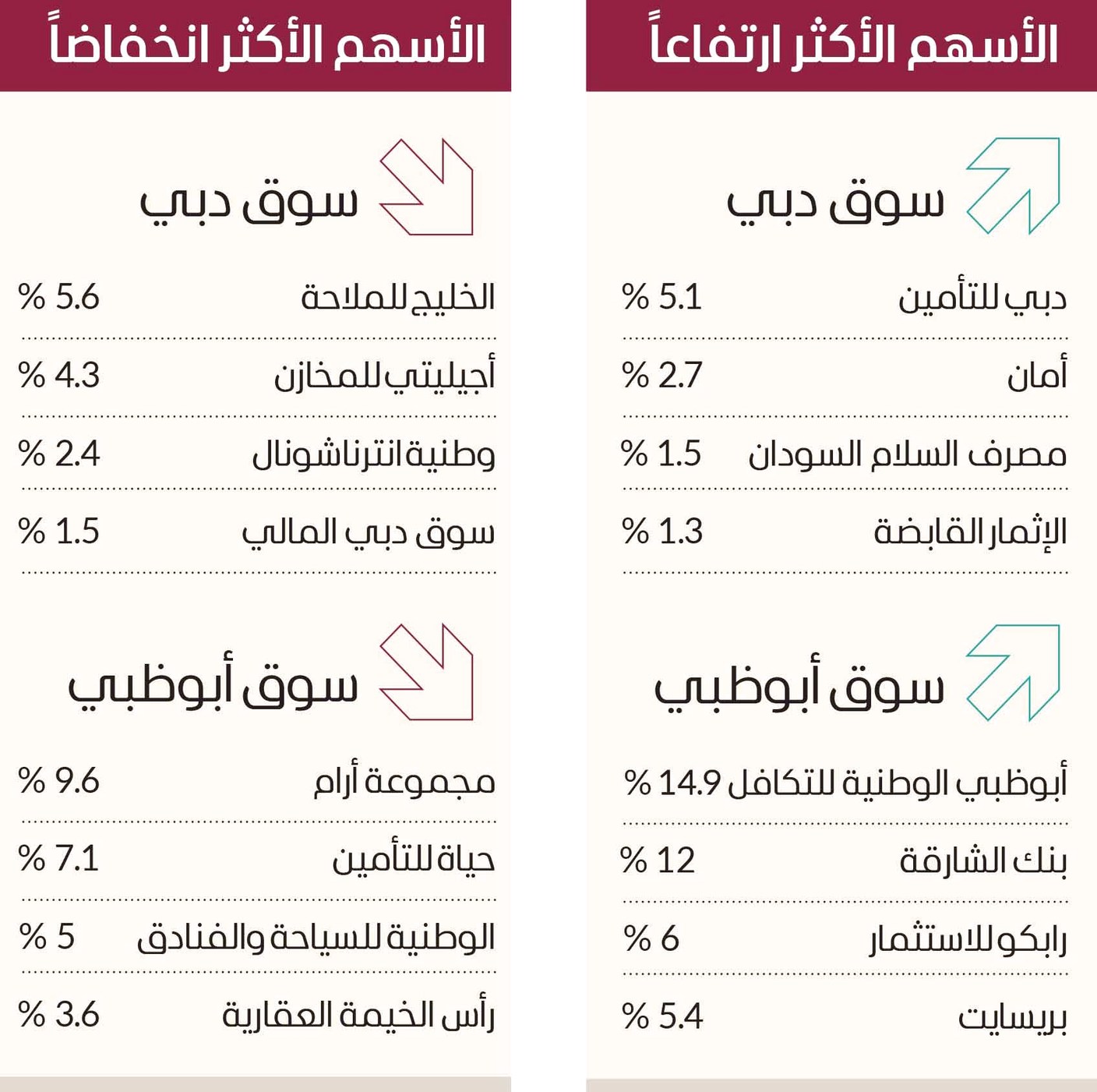 وتصدرت الأسهم الأكثر انخفاضاً، مجموعة أرام 9.6% وحياة للتأمين 7.1% والوطنية للسياحة والفنادق 5% ورأس الخيمة العقارية 3.6%.