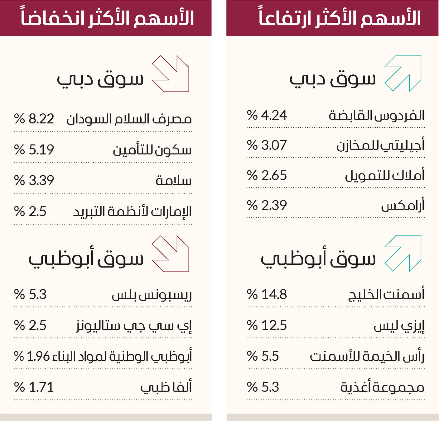 وكانت الأسهم الأكثر ارتفاعاً، أسمنت الخليج بنسبة 14.8 %، وإيزي ليس بنسبة 12.5 %، ورأس الخيمة للأسمنت بنسبة 5.5 %، ومجموعة أغذية بنسبة 5.3 %.