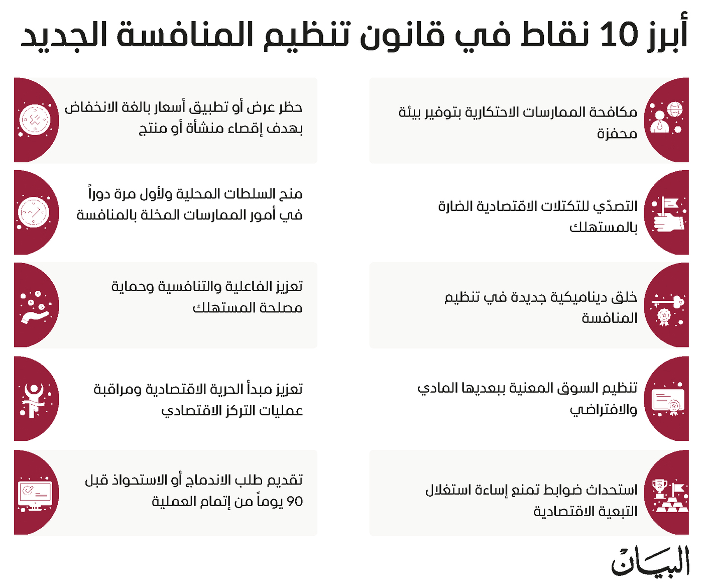 - استحداث ضوابط تمنع إساءة استغلال وضعية التبعية الاقتصادية، بحيث يحظر على أي منشأة أن تقوم بدون أيّي مبرر بأي تصرفات أو أعمال تفضي إلى إساءة استغلال وضعية التبعية الاقتصادية.