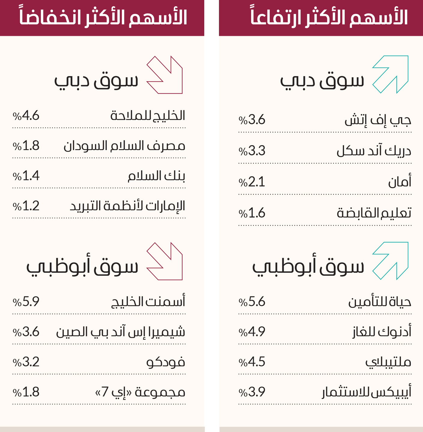 وكانت الأسهم الأكثر ارتفاعاً، حياة للتأمين 5.6%، وأيبيكس للاستثمار 3.9%، وأقفل سهم ملتيبلاي على ارتفاع 4.5% عند 2.33 درهم، وارتفع سهم أدنوك للغاز 4.9% عند 3.20 دراهم، فيما كانت الأسهم الأكثر انخفاضاً، أسمنت الخليج بنسبة 5.9%، وشيميرا إس آند بي الصين 3.6%، وفودكو 3.2%، ومجموعة «إي 7» بنسبة 1.8%.