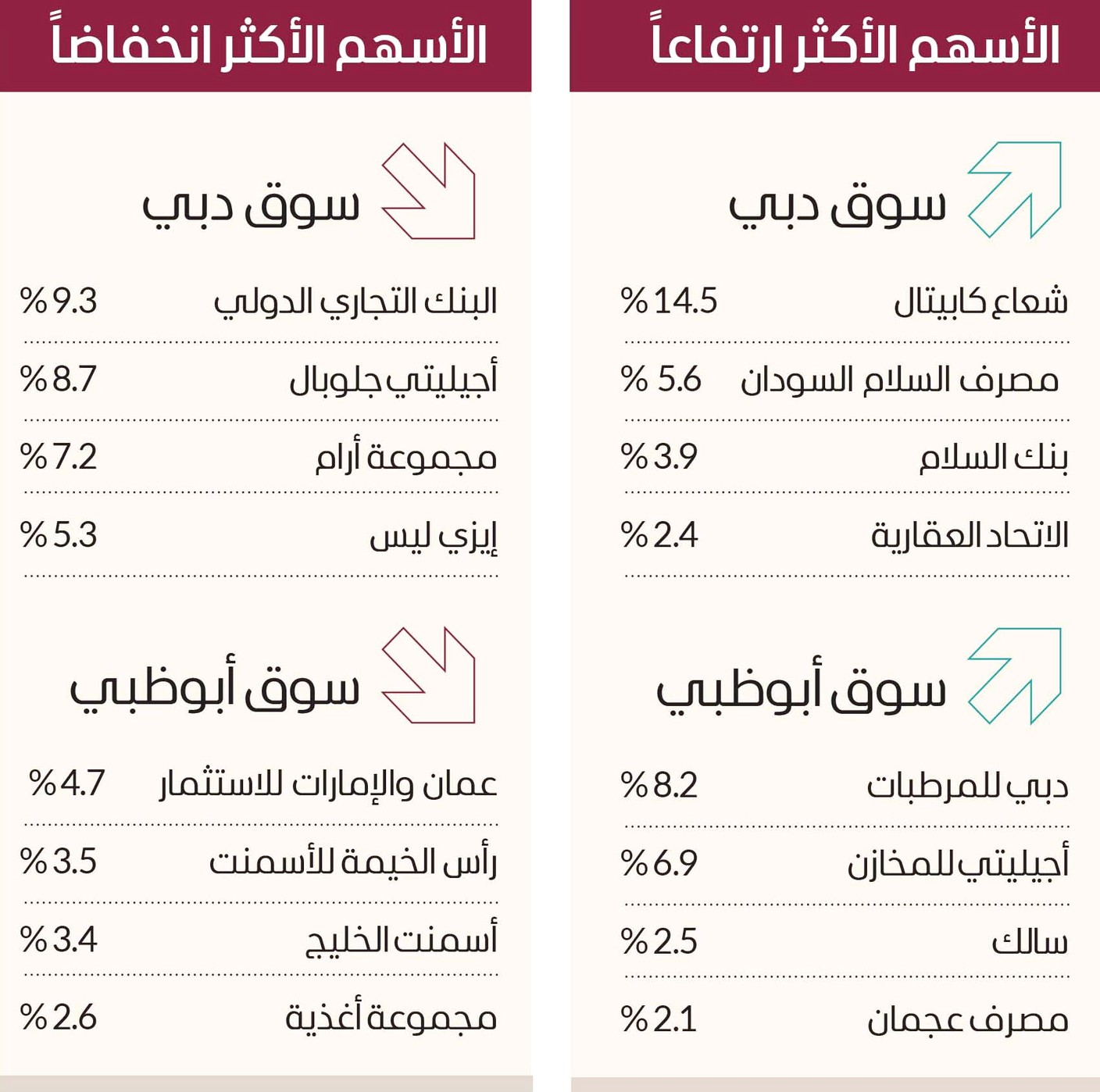 وكانت الأسهم الأكثر انخفاضاً، سهم دبي للمرطبات بنسبة 8.2% وأجيليتي للمخازن بنسبة 6.9% وسالك بنسبة 2.5% وسهم مصرف عجمان بنسبة 2.1%.