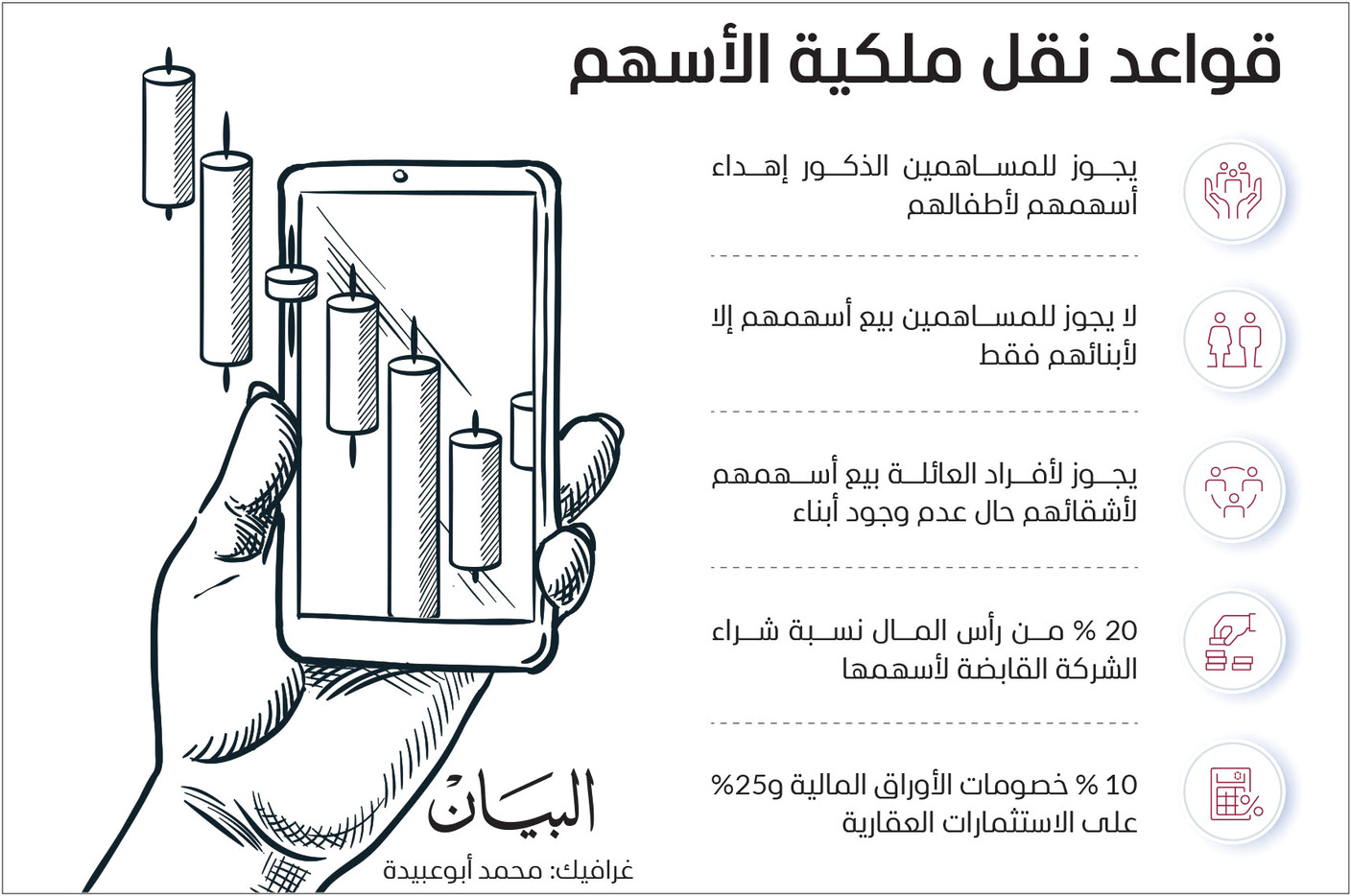 وبحسب القواعد، يجوز للمساهمين الذكور إهداء أسهمهم لأطفالهم الذين من أصالبهم، أما في ما يتعلق بالبيع، تُعرض الأسهم على المساهمين الحاليين في الشركة القابضة على أساس نسبي، بشروط محددة، ولا يجوز للمساهمين بيع أسهمهم إلا لأبنائهم الذين من أصلابهم نظير قيمة رمزية، وطبقاً لأحكام الشريعة، ويجوز لأفراد العائلة الذين ليس لديهم أبناء بيع أسهمهم لأشقائهم.