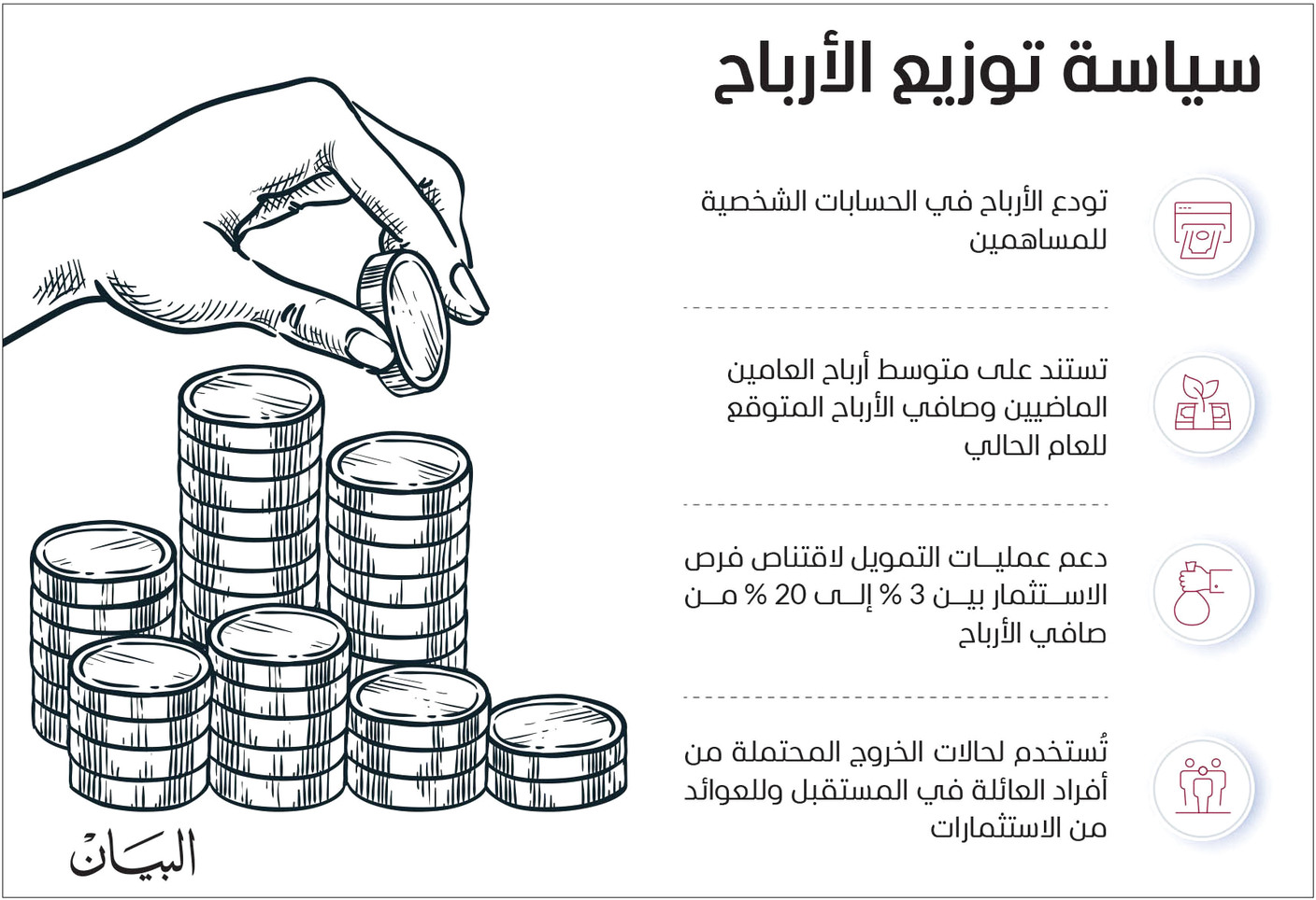 يتولى مجلس إدارة الشركة القابضة، التوصية بدفع الأرباح الموزعة على المساهمين، على أن تعتمد عمليات الدفع جمعية المساهمين، التي تراجع أيضاً سياسة توزيع الأرباح السنوية. وتستند العمليات على متوسط الأرباح للعامين الماضيين، وصافي الأرباح المتوقع للعام الحالي، وتودع الأرباح في الحسابات الشخصية للمساهمين. وتدعم هذه السياسة العائلة بعمليات تمويل لاقتناص فرص الاستثمار التي تتراوح ما بين 3 % إلى 20 % من صافي الأرباح، وتُستخدم لحالات الخروج المحتملة من أفراد العائلة في المستقبل، وللعوائد من الاستثمارات.