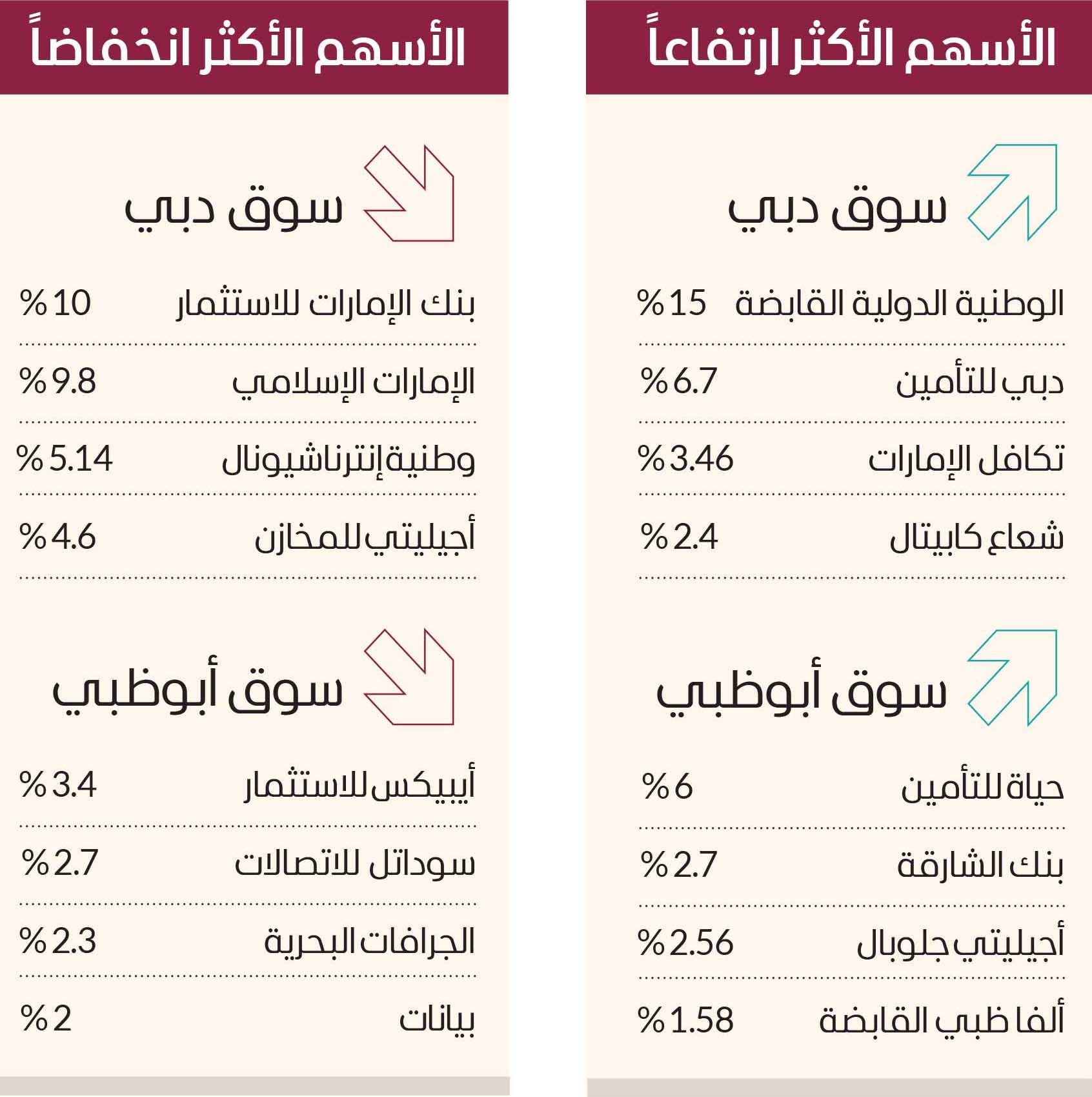 وتعزز أداء سوق دبي بارتفاع أسهم الوطنية الدولية القابضة بنسبة 15%، ودبي للتأمين بنسبة 6.7%، وتكافل الإمارات بنسبة 3.46%، وشعاع كابيتال بنسبة 2.4%، وتيكوم بنسبة 2.2%، والإمارات دبي الوطني بنسبة 2%، ودبي الإسلامي بنسبة 1.7%.