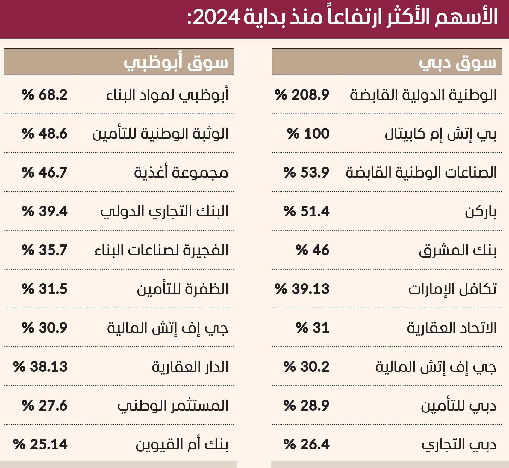 وفي سوق أبوظبي، صعدت أسهم أبوظبي الوطنية لمواد البناء 68.2%، والوثبة الوطنية للتأمين 48.6%، ومجموعة أغذية 46.7%، والبنك التجاري الدولي 39.4%، والفجيرة لصناعات البناء 35.7%، والظفرة للتأمين 31.5% منذ مطلع عام 2024.