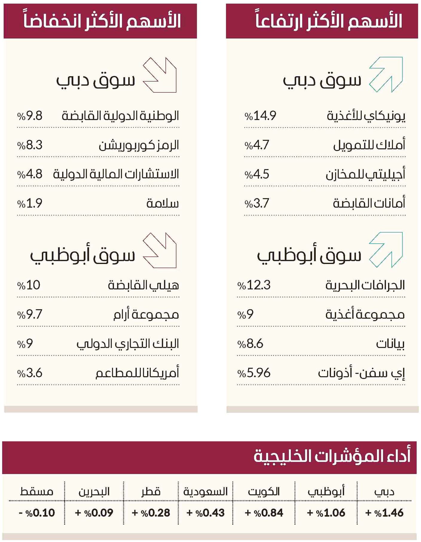 وتدعم أداء سوق أبوظبي، بارتفاع أسهم الجرافات البحرية بنسبة 12.3%، ومجموعة أغذية بنسبة 9%، وبيانات 8.6%، وإي سفن- أذونات بنسبة 5.96%.