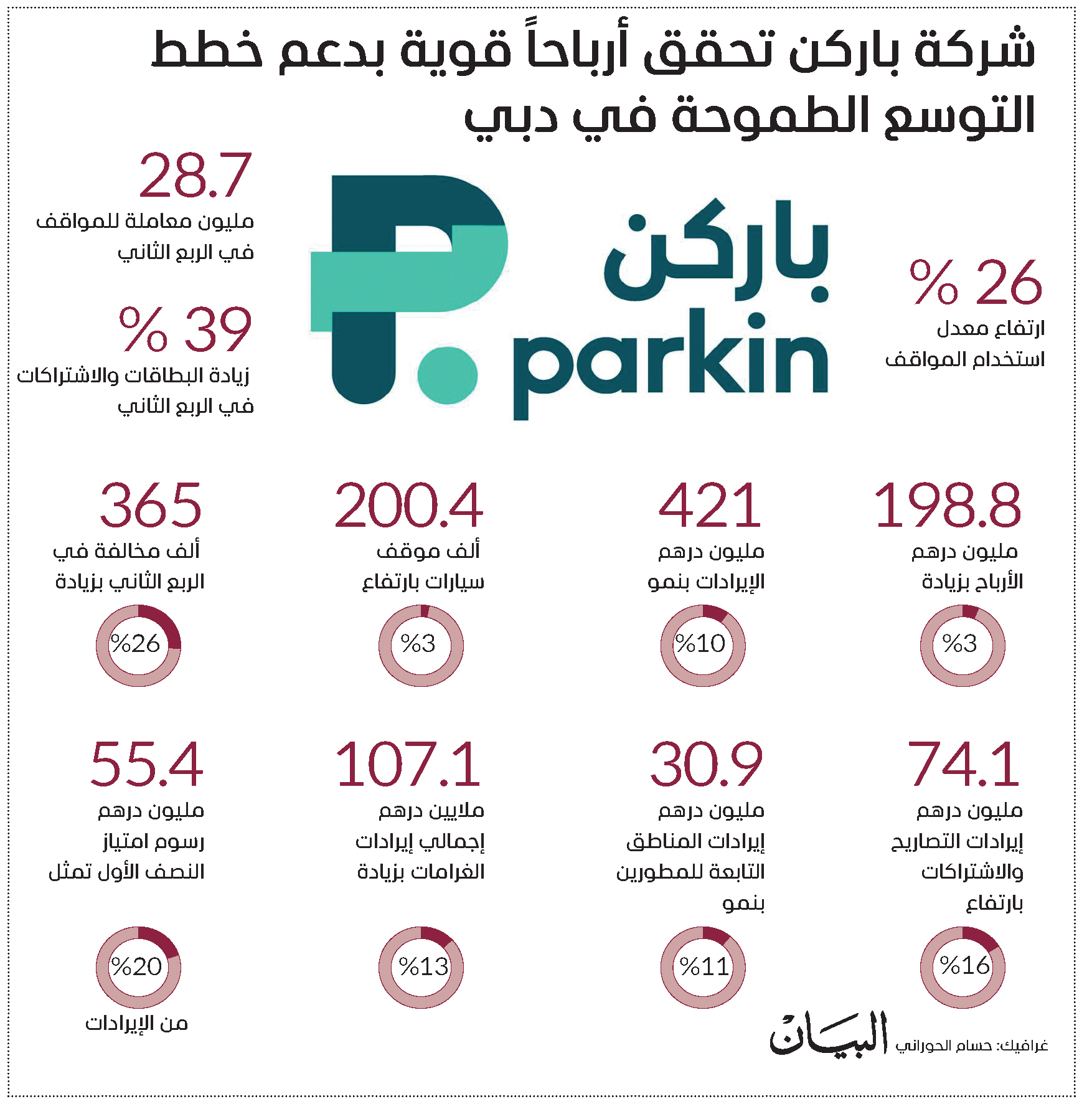 وقد أكدت نتائجنا للربع الثاني على استمرارية النمو في نشاطنا الأساسي وتفوقنا في تنفيذ استراتيجياتنا التوسعية. ومع استمرار النمو المتسارع لعدد السكان واقتصاد دبي، تبقى باركن شريكاً رئيسياً في دعم خطط التوسع الطموحة للإمارة، مع التركيز على تحقيق قيمة مستدامة وطويلة الأمد لمساهمينا».