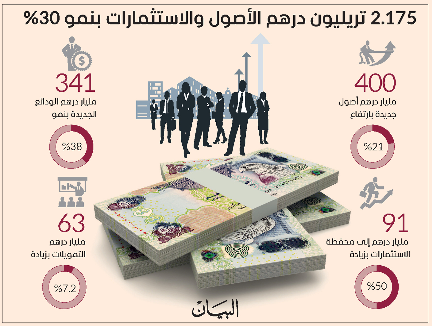 ووفق بيانات المصرف المركزي قفزت محفظة البنوك من الأصول والاستثمارات مجتمعة بقيمة قاربت نصف تريليون درهم على مدار الفترة بنسبة نمو قاربت 30 % إلى إجمالي 2.175 تريليون درهم.وحققت أصول البنوك بمفردها نمواً كبيراً بإضافة أصول جديدة بقيمة 400 مليار درهم حتى نهاية مايو المنقضي من العام الجاري بنسبة نمو 21% عن عام الجائحة، بينما أضافت بنوك الإمارة أكثر من 91 مليار درهم إلى محفظة استثماراتها، خلال السنوات المنقضية بنسبة نمو فاقت 50 %.