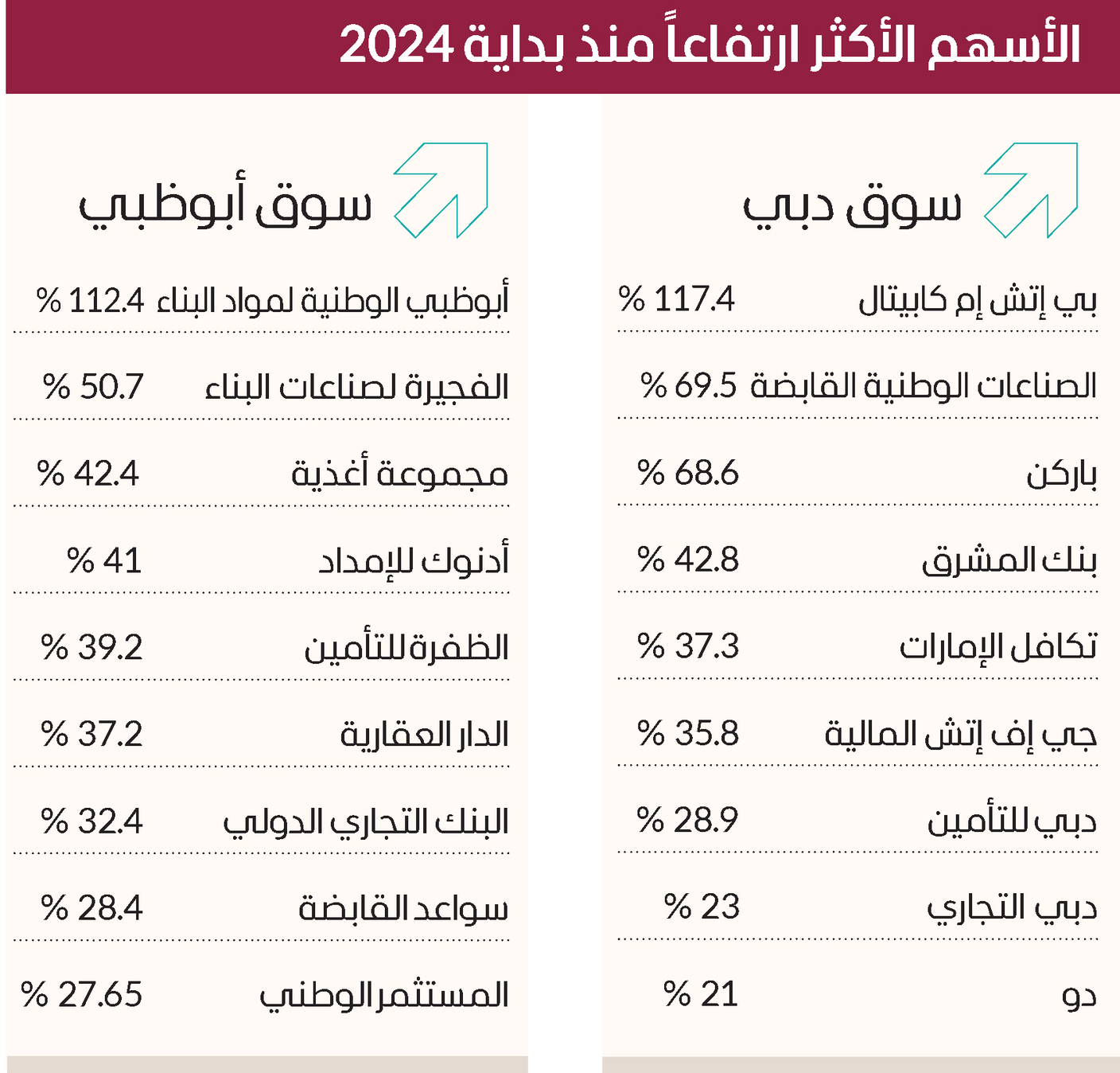 وزاد سواعد القابضة 28.4%، والمستثمر الوطني 27.65%، وبنك الشارقة 25.5%، وأبوظبي الإسلامي 24.7%، والوثبة الوطنية للتأمين 23.7%، وجلفار 22.2%، منذ مطلع عام 2024.