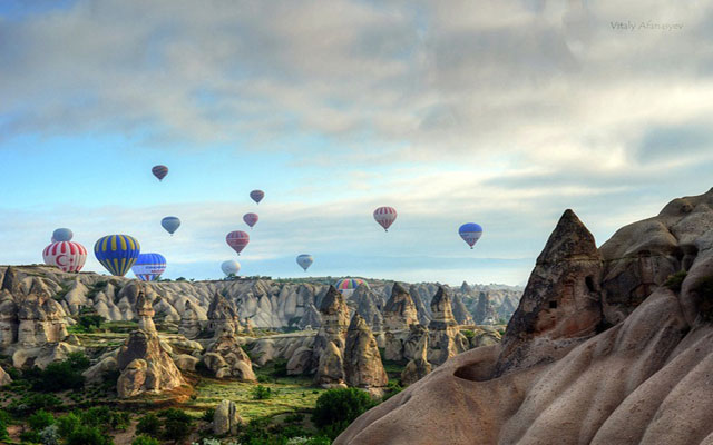تتمتع كابادوكيا وهي منطقة واقعة وسط الأناضول في تركيا، بالمشهد الأكثر إثارة في أوروبا نظراً للصخور والأعمدة التي يصل ارتفاعها إلى أربعين متراً، تشكلت بفعل الرياح والأمطار التي أدت إلى تآكل طبقات الصخور الرملية ورماد البركان مشكلة سطحا صخرياً فريدا يشبه لونه لون القمر، فضلا عن مشاهد المناطيد الهوائية التي تسبح في سمائها مشكلة صورة بانورامية تحبس الأنفاس.