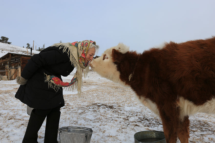 ليوبوف التي كانت تعمل مهندسة تقنية قبل تقاعدها، تعيش في بيت متواضع وتعتني بحيواناتها التي تؤنس وحدتها منها الكلاب، والقطط ، والديوك والدجاجات والبقر والثيران، إذ تستيقظ في الساعة 5.30 صباحا للعناية بالأبقار وتركها ترعى على تلة كل يوم، ولتقصير المسافة، تنتقل العجوز إلى حيواناتها عن طريق التزلج عبر البحيرة المتجمدة.