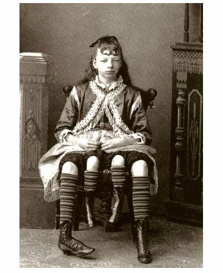 ولدت جوزيفين ميرتل كوربن في ولاية تكساس أو ولاية تينيسي في عام 1868، بتشوه خلقي، أدى إلى نمو أطراف سفلية إضافية لتوأم لم يكتمل نموه. كانت ساقيها القصيرتين ضعيفتين ولم تتمكن من الوقوف عليهما ولكنها كانت تحركهما باستمرار. وكانت قدمها اليمنى مقوسة. في الواقع فإن المرأة ذات الأرجل الأربعة لا تملك سوى رجل واحدة سليمة. كانت امرأة جميلة ببشرتها الفاتحة وشعرها الأحمر وعيونها الزرقاء وتتمتع بذكاء حادق وشخصية محبوبة.