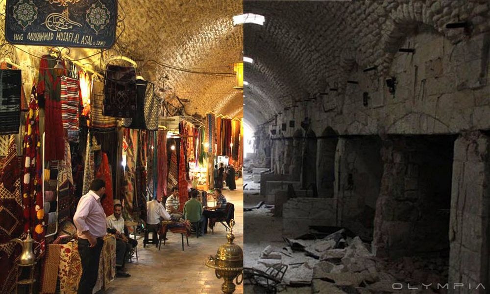 الصور التالية التي تظهر مقارنة بين مختلف معالم حلب قبل وبعد أن بدأت الحرب نشرها مطعم أولمبيا القائم في المدينة.