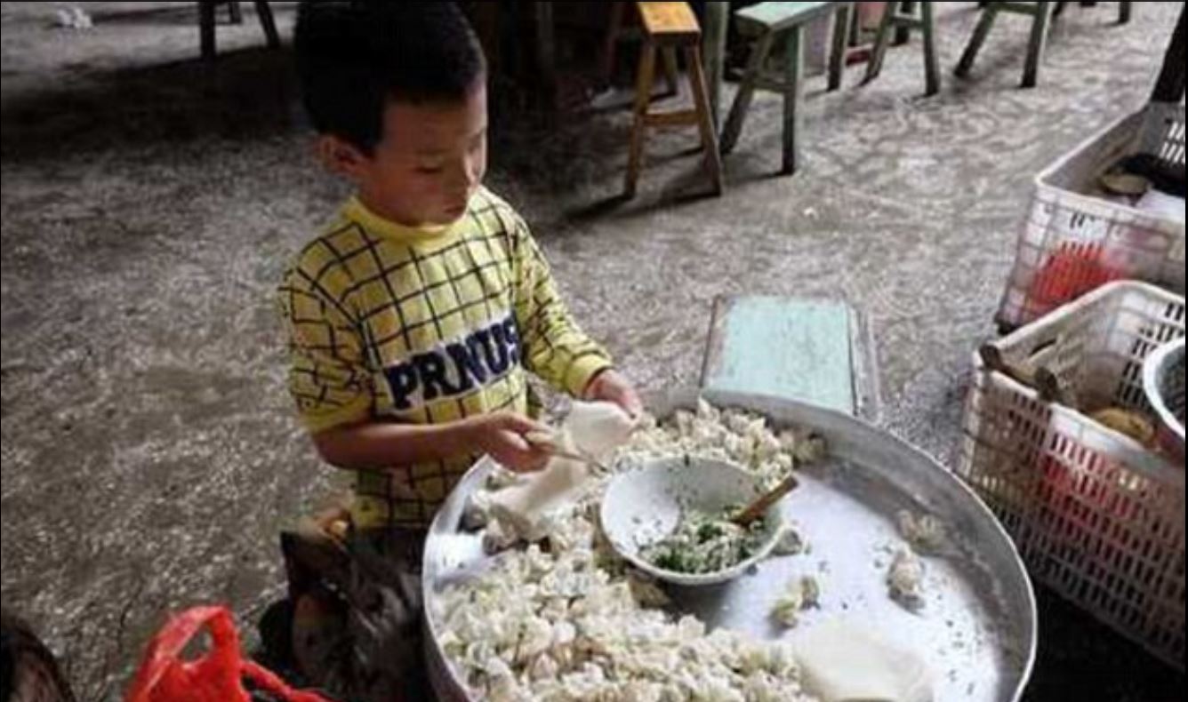 معظم الأطفال الذين لا تتجاوز أعمارهم الثمانية سنوات يقضون وقتهم في الذهاب إلى المدرسة ومن ثم اللعب مع الأصدقاء .ولكن بمجرد وصول هذا الطفل الصيني إلى البيت بعد انتهائه من المدرسة، يمضي ساعات في تحضير عشرة آلاف حبة من معجنات داملينغ التقليدية أو الزلابية للمساعدة في إعالة أسرته.