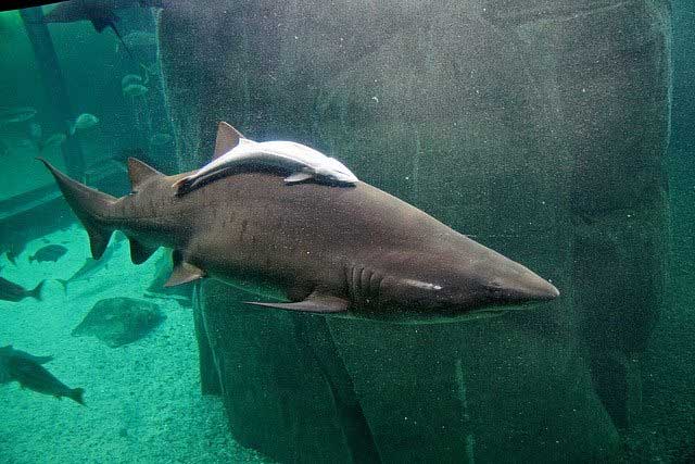 تدعى هذه السمكة بـ "الريمورا' (اللزاق) وهي نوع من السمك تجد على رأسه ممص يشبه نعال الأحذية يساعده على الالتصاق بأسماك القرش والحيوانات البحرية الأكبر حجما للاحتماء بها أو مشاركتها طعامها.