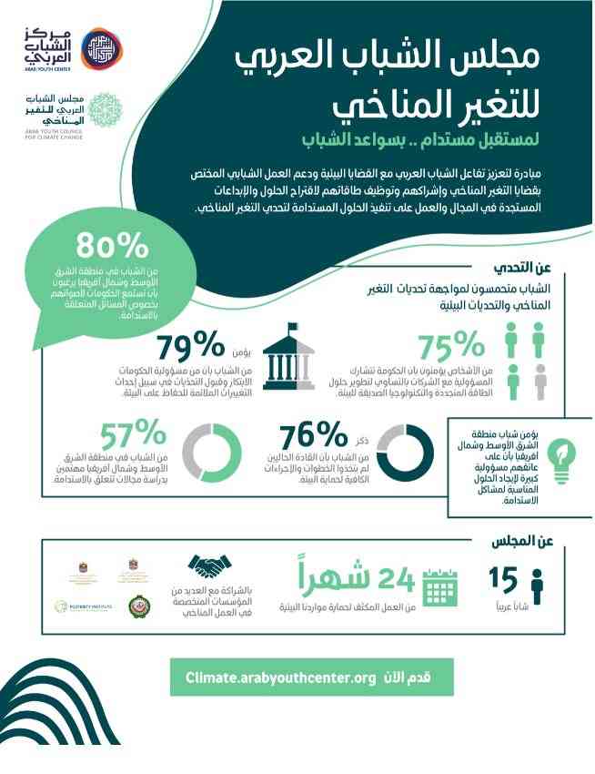 وكان مركز الشباب العربي أطلق في أغسطس 2021 "مجلس الشباب العربي للتغير المناخي" بالتزامن مع فعاليات اليوم العالمي للشباب، ليشكل منصة إقليمية تعزز تفاعل الشباب العربي مع القضايا البيئية، وتدعم الاستراتيجيات العربية المتعلقة بالبيئة والتغير المناخي، وتسهم في إعداد شباب مبتكرين في مجال العمل المناخي.