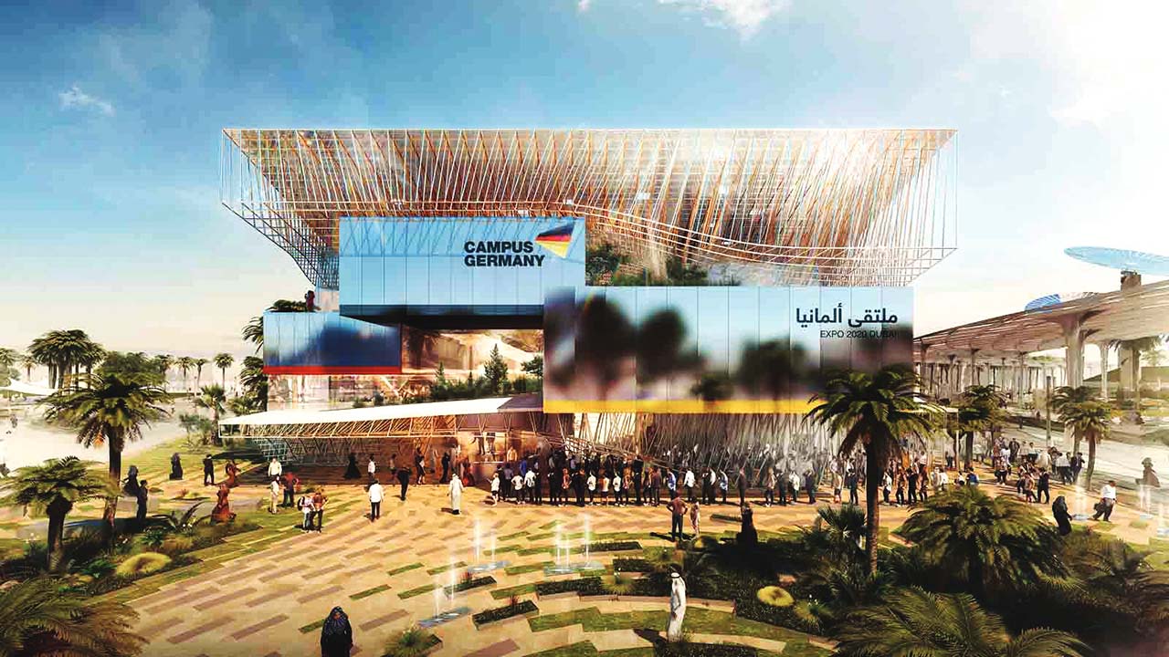 يُقدّم الجناح الألماني نفسه للزوار في الجزء المخصص لمعالجة موضوع الاستدامة في إكسبو 2020 دبي، وذلك تحت عنوان «ملتقى ألمانيا» (CAMPUS GERMANY)، حيث يضم صالات عرض متعددة يشتمل كل منها على مجموعة من المعروضات التي تعالج مواضيع مختلفة وهي: الطاقة، ومدينة المستقبل، والتنوع الحيوي. اعتباراً من أول أكتوبر 2021، سوف يتم في هذا الإطار عرض 63 قطعة من المعروضات المبتكرة والخلاقة التي تدور جميعها حول موضوع الاستدامة. عبّر ديتمار شميتس، المفوض العام لشؤون الجناح الألماني عن سروره قائلاً: «تبهرنا الاحترافية التي يتميز بها المعرض والانطباع العام الذي يخلفه الجناح. ونحن في غاية السرور بالمحتويات المنتقاة التي تسلط الضوء على موضوع الاستدامة». تأتي الإطلالة الألمانية في إكسبو بتكليف من الوزارة الاتحادية للاقتصاد والطاقة، والتي أسندت بدورها تنظيم وتنفيذ المشروع إلى شركة كولنميسى.