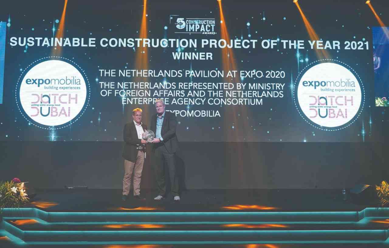 حظيت شركة إكسبوموبيليا بالإشادة بالنيابة عن الجناح الهولندي في معرض إكسبو 2020 دبي نظراً للمفهوم الذي تطرحه، وهو «البيئة الحيوية في الصحراء»، فضلاً عن نهجها المتبع في البناء المستدام. وقد تم استئجار مواد البناء محلياً، وهي قابلة لإعادة الاستخدام أو إعادة التدوير أو قابلة للتحلل. كما حصل نظام المناخ الدائري المؤقت على جائزة «أفضل مشروع بناء مستدام لهذا العام» في مسابقة جوائز بيج 5 للتأثير، وهي إحدى جوائز البناء المرموقة في دولة الإمارات العربية المتحدة. وقد تم إنشاء مشروع الاستدامة بنهج شامل من حيث الهندسة المعمارية والتصميم والتجسيم والبناء. وأدى التعاون الإبداعي من قبل كل من المقاول الرئيسي شركة إكسبوموبيليا وشركة في 8 أركتيكتس والشركة الهندسية؛ فيتيتفين + بوس والمصممين ذوي الخبرة في شركة كوسمانديجون جميعاً إلى إحياء نظام الدوران المغلق الذي تبلغ مساحته 3493 متراً مربعاً في الجناح الهولندي.