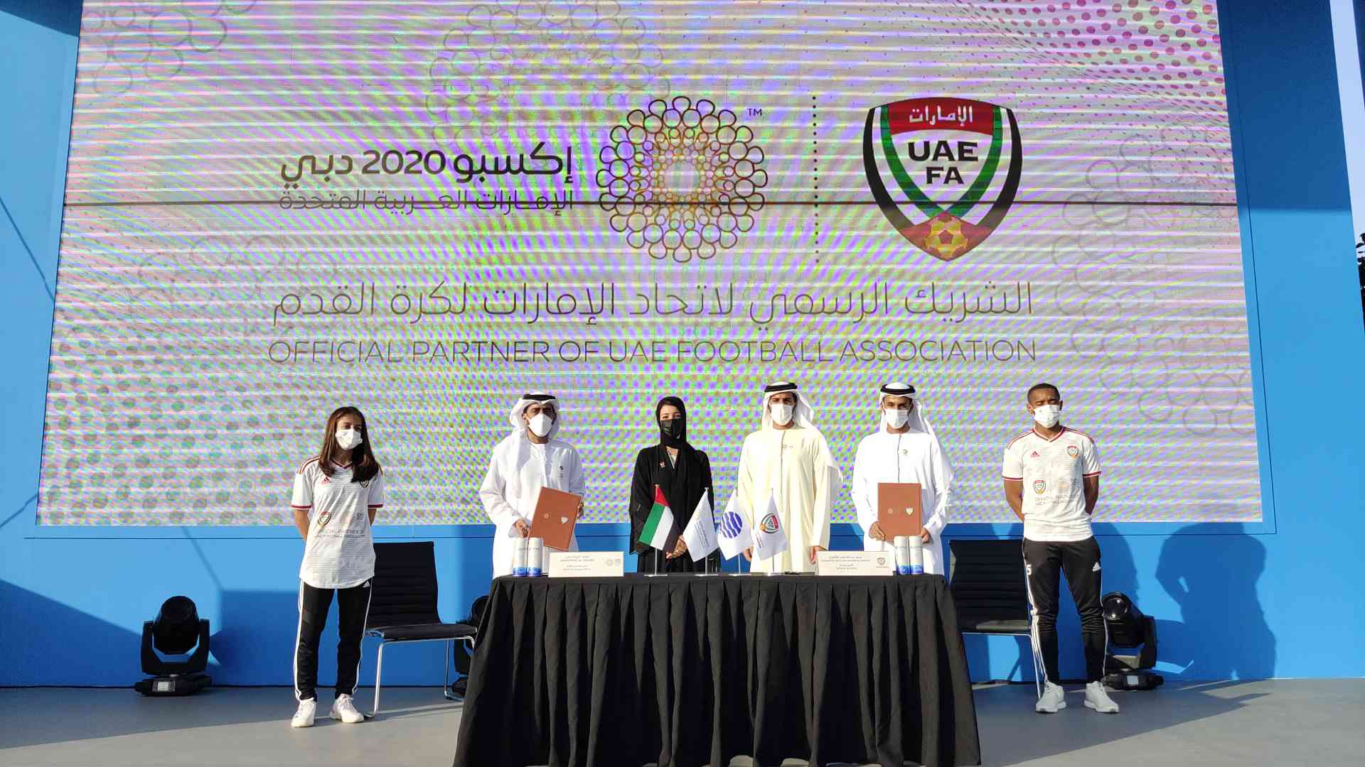 وقع الاتفاقية محمد عبدالله هزام الظاهري الأمين العام لاتحاد الإمارات لكرة القدم، ومحمد الهاشمي، الرئيس التنفيذي للتقنية في إكسبو 2020.