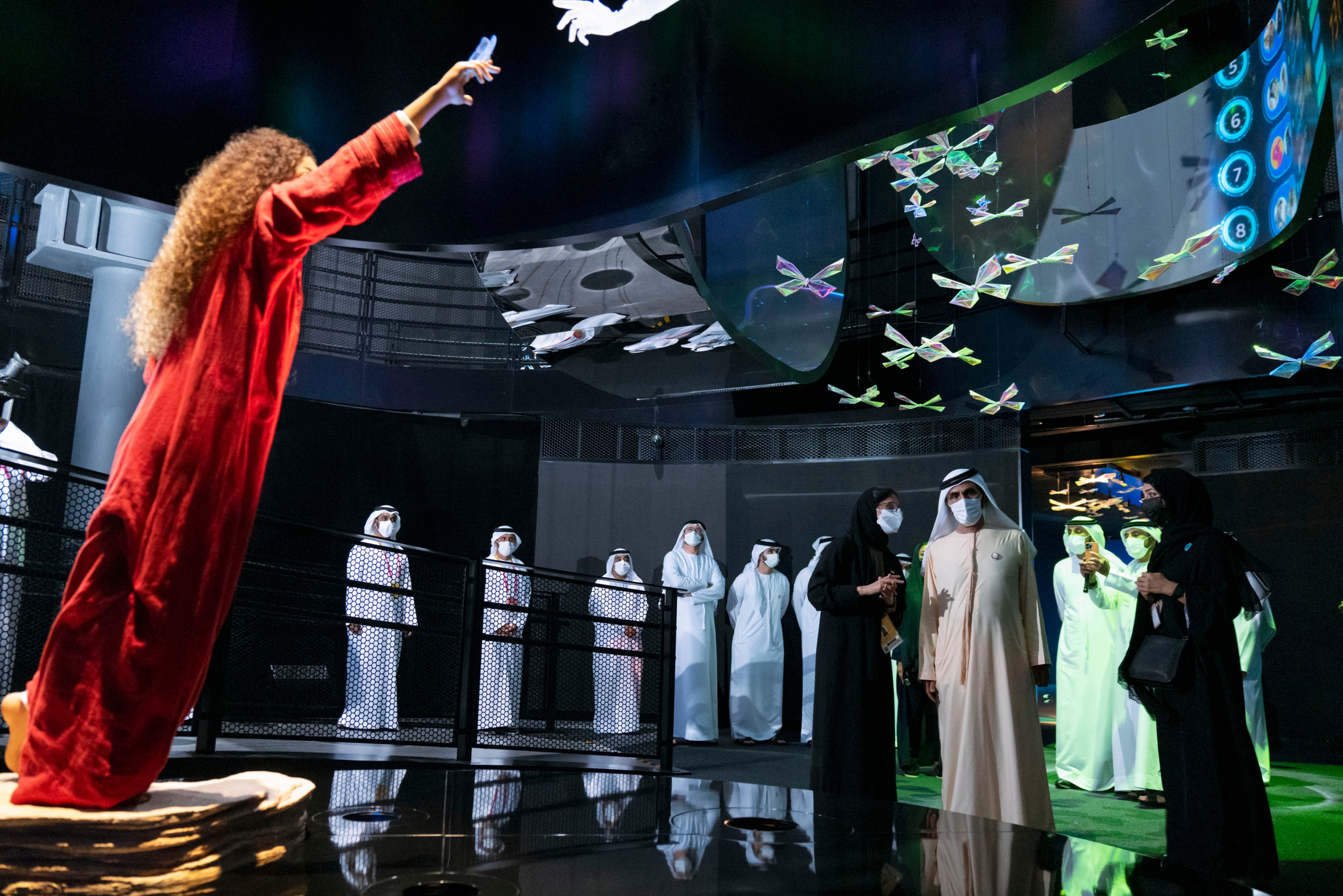 وتابع سموه من خلال جولته في الجناح تطور مفاهيم ووسائل الانتقال عبر الزمن، وصولاً إلى القرن الحادي والعشرين، حيث يأخذ الجناح زواره إلى عالم افتراضي مفعم بالبيانات، قبل الانتقال بهم إلى مدينة المستقبل، حيث يتم إبراز ملامح من مستقبل التنقل، مع إلقاء الضوء على التقدم الهائل الذي حققته دولة الإمارات على مدار الخمسين عاماً الماضية في مجالات الطيران والخدمات اللوجستية والمدن الذكية، فضلاً عن التوسع في مجال علوم واكتشافات الفضاء عبر برنامج الإمارات الوطني للفضاء ومشروع الإمارات لاستكشاف المريخ "مسبار الأمل".