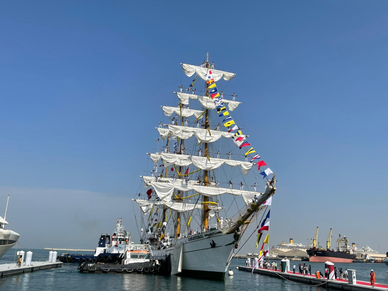 رست السفينة الشراعية الضخمة "كواوتيموك"، المعروفة باسم "امباسادور" و"جنتلمان أوف ذا سيز" التابعة للقوات البحرية المكسيكية مزينة بالأعلام في ميناء راشد اليوم الإثنين في الثامن من نوفمبر، بعد أن انطلقت في رحلتها التي تحمل اسم رحلة إكسبو 2020 دبي في رسالة تعبر عن الصداقة وحسن النوايا بين المكسيك ودولة الإمارات العربية المتحدة.