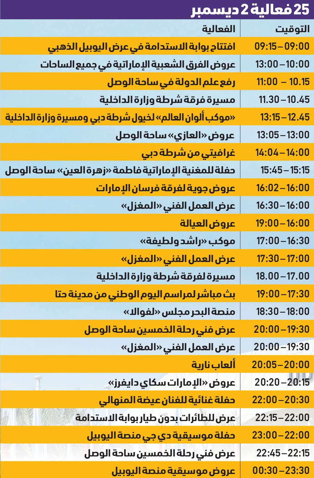 وتشهد الاحتفالات يوم الثاني من ديسمبر فعاليات متنوعة وكثيرة تشمل البدء بافتتاح بوابة الاستدامة في عرض اليوبيل الذهبي، فيما سيكون ذلك في تمام التاسعة صباحاً ولمدة 15 دقيقة لاحقة، فيما ستنتشر الفرق الشعبية الإماراتية في جميع الساحات داخل "إكسبو دبي 2020"، لنشر الأهازيج والأغاني التراثية الرائعة، فيما سيكون ذلك بين العاشرة صباحاً وحتى الواحدة ظهراً.