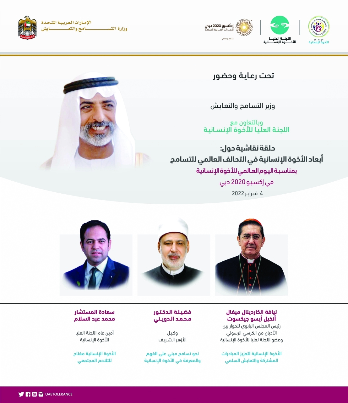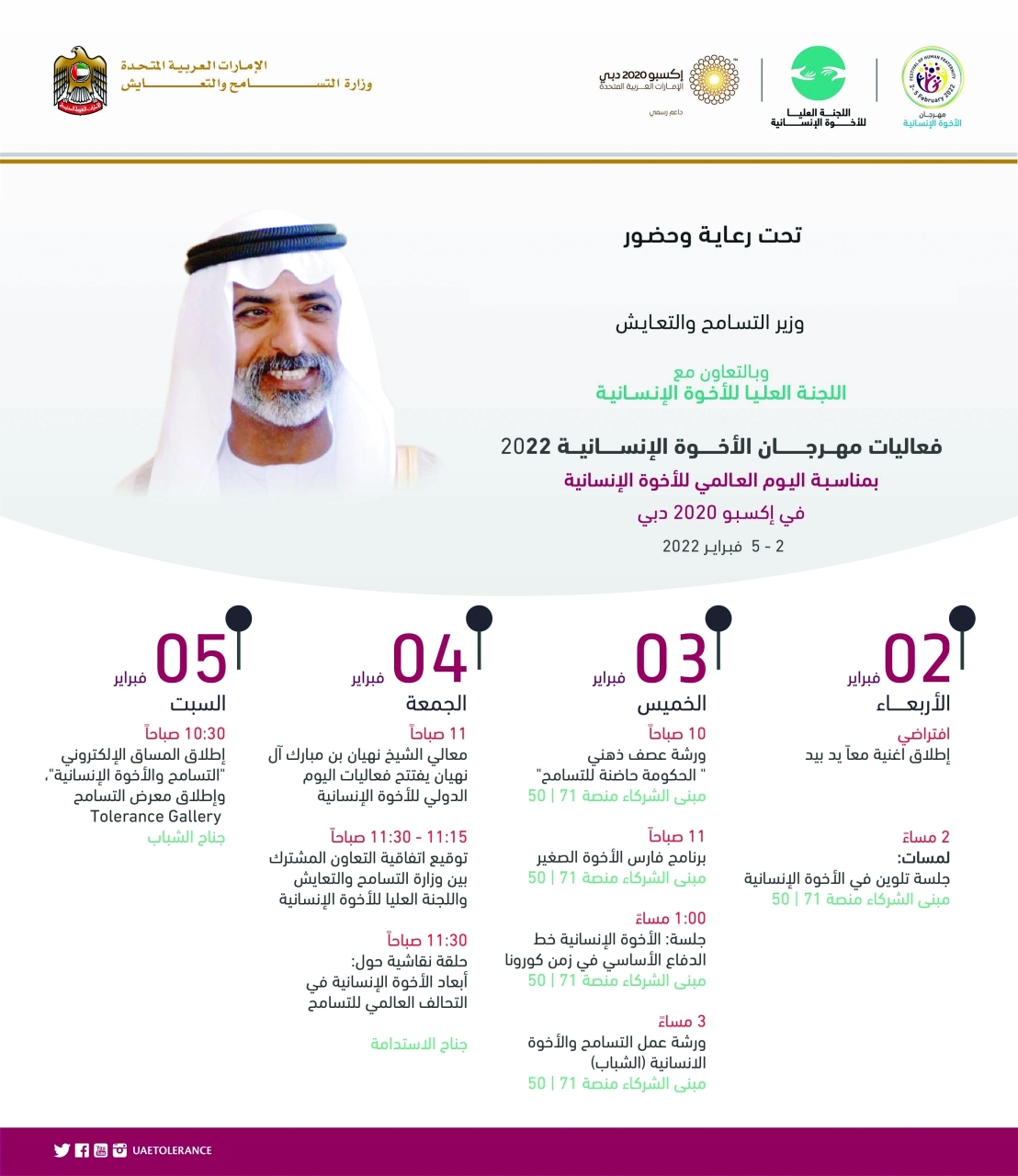 ينطلق اليوم في «إكسبو 2020 دبي» مهرجان الأخوة الإنسانية في نسخته الثانية، الذي تنظمه وزارة التسامح والتعايش بالتعاون مع اللجنة العليا للأخوة الإنسانية وبحضور دولي وعربي بارز وبمشاركة الأزهر الشريف والفاتيكان، على مدى 4 أيام.