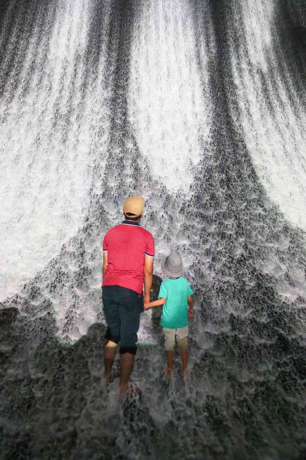 على أنغام مقطوعة أوركسترالية أبدعها ملحن موسيقى «صراع العروش» يتحد الماء مع الأرض والنار لتشكيل شلالات إكسبو التي تضم صفائح مائية عملاقة تنحدر على جدران عمودية بارتفاع 13 متراً.