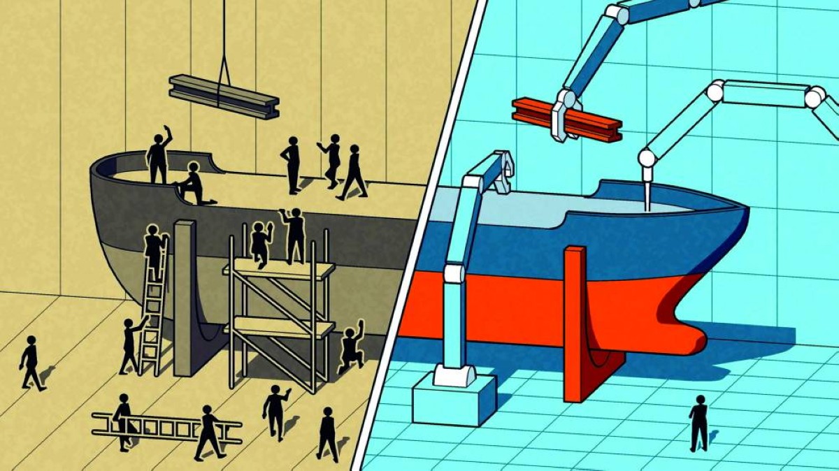 في السابق، كانت عمليات تشكيل المعادن على هذا النطاق، تستغرق سنوات طويلة، وتتطلب مئات العمال. أما اليوم، فلم ألحظ داخل هذا المبنى الهائل، الذي تزيد مساحته قليلاً على حجم ملعب كرة قدم، سوى أقل من عشرين عاملاً، يوجهون أذرعاً روبوتية تقوم بأعمال اللحام وتشكيل الفولاذ بأحجام ضخمة، وفي وقت قياسي، لا يقارن بما كانت تستغرقه الطرق اليدوية التقليدية.