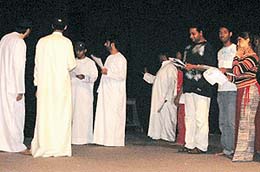 جمعية المسرحيين هي الأخرى دخلت على الخط لتنظم بشكل أكثر دقة عروض الموسم الصيفي والتي تلاقي هذه الأيام نجاحا كبيرا في جهة التفاعل الجماهيري وفي جهة تفعيل نشاط الفرق المسرحية..حيث تطوف هذه الأيام ستة أعمال مسرحية محلية مدن وقرى الدولة لتقدم عروضا تتنوع في أطروحاتها ومواضيعها وأساليبها الفنية، وبجانب هذا النشاط أقامت الجمعية ورشة مسرحية في فن البانتومايم باستدعاء الفنانة اللبنانية خلود الناصر للإشراف عليها..