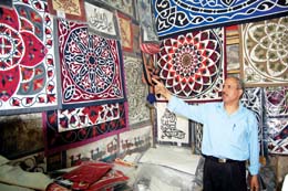 هناك في منطقة الدرب الأحمر - إحدى بقاع القاهرة القديمة، وبالتحديد في شارع «الخيامية» - كان لقاؤنا بهذا الرجل الحاج أشرف الذي يلقبه أهل منطقته بالفنان، حيث يقطن ويعمل هو وعائلته وجيرانه المتخصصين في صناعة الأقمشة الملونة التي تستخدم في عمل السرادقات والكتابة والرسم على المعلقات الحائطية والمفارش والستائر التي تتسم بالزخارف الشعبية بروح عصرية.