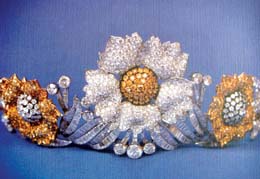 ، التحفة الأولى تاج الأميرة شويكار زوجة الملك فؤاد الأول وهو تاج من البلاتين مرصعٌ بـ 2159 ماسة غالبيتها ذات حجم متوسط وكبير بالإضافة إلى 11 حبة من اللؤلؤ، أما التحفة الثانية فهي تاج وطاقم من الحلي النادر للملكة ناريمان، الزوجة الثانية للملك فاروق، وهو مصنوع من البلاتين والذهب الأصفر معًا على شكل ورود، ومرصع بـ 1560 ماسة.