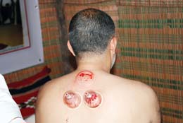 علما أنه يتم استخدام كؤوس بلاستيكية معقمة ومشارط معقمة وأدوات تعقيم طبية، مؤكدا أيضا أن الحجامة تعالج الكثير من الأمراض منها وظائف الكبد ومرض السكر وعلاج ضغط الدم المرتفع والصداع النصفي «الشقيقة» والأمراض الجلدية وحساسية الصدر ( الربو ) الشلل المخي للأطفال والشلل النصفي وشلل الوجه والحد من الكوليسترول والنقرس والخمول وتحسين كريات الدم الحمراء والبيضاء والصفائح الدموية وأمراض النساء والولادة والغدة الدرقية وإصابات الملاعب.