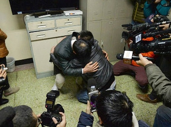 ووسط حشد من الصحفيين ورجال الأمن وصل الأب المركز، فسارع نحو ابنه وارتمى في حضنه ثم سقطا أرضاً متعانقين، في مشهد مؤثر أبكى جميع الحاضرين، وكل من عرف وشاهد هذه اللحظة المؤثرة في الصين، ثم حضن أخته بقوة وكأنها ليست المرة الأولى التي يتعرف عليها.