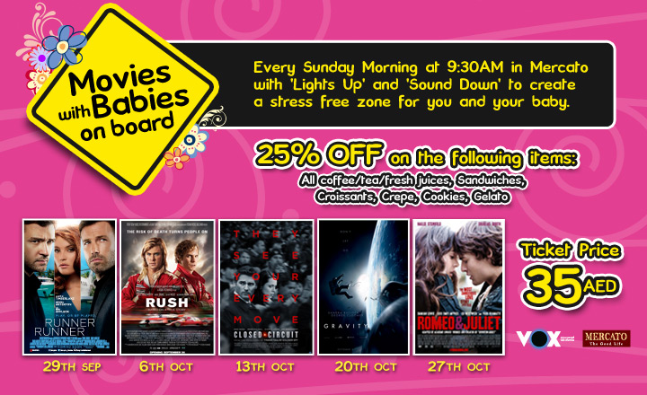 وستعرض «ڤوكس سينما» في «ميركاتو مول» مجموعة من أحدث أفلام الموسم في تجربة سينمائية تراعي وجود للصغار كالإنارة غير الخافتة والصوت المعتدل غير المضخَّم، وذلك كل يوم أحد عند الساعة 9:30 صباحاً مقابل 35 درهماً للكبار.