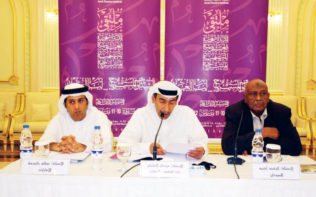 وكان ملتقى الشباب والمسرح قد انطلق يوم السبت الماضي، بمشاركة عدد من المسرحيين العرب الذين استضافتهم الهيئة العربية للمسرح، من بينهم الحبيب غزال من تونس، وياسر سيف من البحرين، وياسر مدخلي من السعودية، وفيصل العميري من الكويت، والدكتورة سعدء الدعاس من الكويت، ومحمد فوزي من مصر. والدكتور سعيد الناجي من المغرب، والدكتور غسان عبدالخالق من الاردن. بالإضافة الى ماهر الصليبي من سوريا وعدد من المسرحيين الاماراتيين.