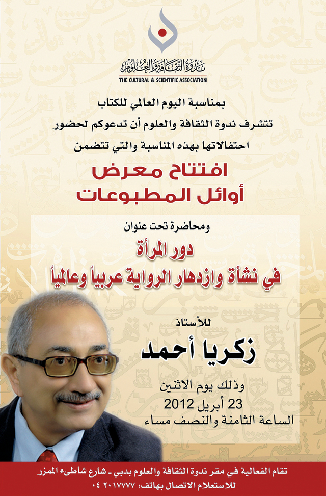 ضمن احتفالاتها باليوم العالمي للكتاب تنظم ندوة الثقافة والعلوم بدبي يوماً بهذه المناسبة يتضمن افتتاح معرض لأوائل المطبوعات، يحتوي عدداً من الكتب النادرة التي تعود طبعاتها إلى أواخر القرن التاسع عشر وأوائل القرن العشرين، يعقب ذلك محاضرة يلقيها الباحث والناقد زكريا أحمد تحت عنوان (دور المرأة في نشأة وازدهار الرواية عربياً وعالمياً)، وذلك يوم الاثنين في الساعة الثامنة والنصف مساءً بمقر الندوة في منطقة الممزر بدبي.