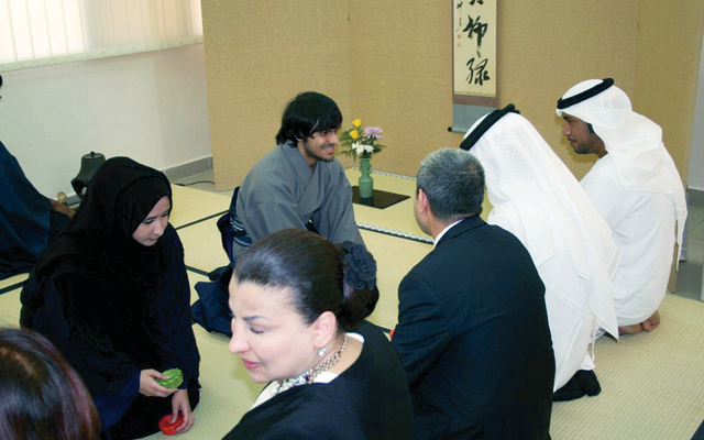 كان على الحضور أن يجلسوا على الأرض بذات الطريقة التي يجلس فيها اليابانيون عند تناول الشاي، فتاة وشاب من الإمارات، يلبسون زيا يابانيا تقليديا، ويوزعون لفائف ورق مطوية على الحضور، وضع في داخلها قطع من الحلوى الجافة، بينما تشرف على كل هذه المراسم معلمة تقديم الشاي ماتسو بارا. إنها الجلسة الأولى في المركز الثقافي الياباني في أبوظبي، والذي افتتحه أمس الدكتور مغير الخييلي مدير عام مجلس أبوظبي للتعليم، بحضور تساتسوو واتانابي سفير اليابان لدى الدولة، وهدى كانو مؤسس مجموعة أبوظبي للثقافة والفنون، وعدد من المسؤولين.