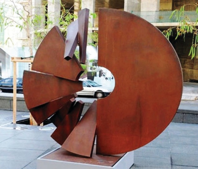 والمعرض تجربة في النحت الهندسي، ويضمّ 16 منحوتة صنع بصبوص معظمها من الحديد والمعدن، باعتبار أن هذه المواد التي تعالج بالإضافات هي قريبة الى علم الهندسة، وفق قوله لـ"البيان"، علماً أن مبدأ عمله يقوم على جمع الأشكال المختلفة وجعلها متداخلة ومتكاملة، مع المحافظة قدر الإمكان على شكلها الأساسي ومحوّلاً إياها الى منحوتات فنية متميزة. واللافت أن معظم أنصابه النحتية مطليّة بألوان الصدأ الذي يكتنف الحديد.