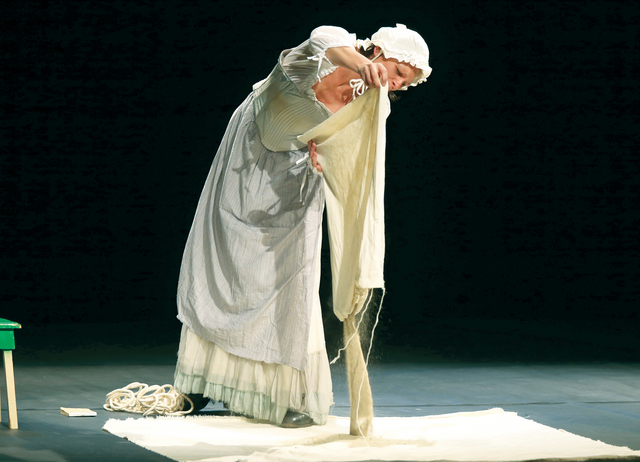 وتتابع سرد حكايتها الشعرية وهي ترمي وتمزق قصائده حيناً، وحيناً آخر تغربل بغربالها غبار الزمن، لتجول في خشبة المسرح ضمن حلقة مفرغة.