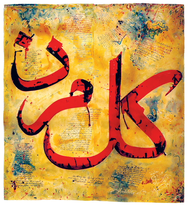 وفي هذا العمل، يقدم الفنان علي عمر أرميص قصيدة للشاعر عنترة بن شداد يصف فيها معاركه وتعقيدات الحياة وأبعادها الكثيرة. ومن خلال عدة طبقات من الأورانج والأحمر والبنفسجي، تتخللها نصوص وأحرف تقدم مسرحية نصية ثرية، يقوم الفنان بتضمين أبيات القصيدة كاملة والبالغ عددها 85 بيتاً ببراعة في مجموعة من الأحرف المتعددة بأحجام متنوعة، وتجمع القصيدة ما بين المعرفة والتجربة والتاريخ، وتحدد في الوقت ذاته مجموعة القوانين الأخلاقية للمجتمع.