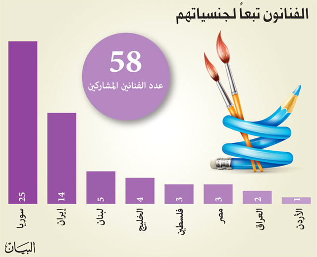 تصدرت المنافسة في المزاد اللوحات الفنية التي اعتمدت الأسلوب الفني التقليدي في الرسم بألوان الأكريليك والزيتية لمواضيع معاصرة، إلى جانب عدد من المنحوتات. وضمت قائمة الفنانين 10 جنسيات من منطقة الخليج العربي ومجموعة بلدان عربية أخرى، إضافة إلى إيران. وكانت النسبة الأكبر من الأعمال لفنانين سوريين، تليها أعمال لفنانين من لبنان وفلسطين ومصر والعراق.