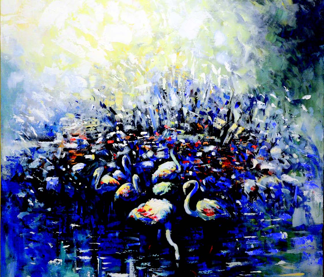 أما فيما يخص اللوحات المرسومة بالألوان الزيتية، فتستوقف الزائر تجربة الفنانة المحلية فرح اليوسف التي تتجلى خصوصية لوحاتها، في مهارتها بمعالجة الألوان لتشكل بأسلوب الفن التجريدي لمساحات لونية محدودة، مشهداً بديعاً من الطبيعة، كذلك الأمر بالنسبة للوحة «طيور الفلامنكو» التي تتنقل حيوية وبهجة ألوانها إلى المشاهد بتلقائية. كما تستوقف الزائر لوحة (المرأة البدينة) للفنانة وفاء يحيى التي تحمل الكثير من الطرافة في موضوعها وجمالية في الأسلوب والرسم المرتكز على تناغم الألوان مع طرافة الحالة.