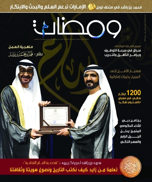 وتضمن العدد الجديد من (ومضات) تغطية لحفل تكريم صاحب السمو الشيخ محمد بن راشد آل مكتوم، نائب رئيس الدولة رئيس مجلس الوزراء حاكم دبي « رعاه الله»، لفوز سموه بجائزة شخصية العام الثقافية الخاصة بجائزة الشيخ زايد للكتاب في دورتها التاسعة. إذ كرمه صاحب السمو الشيخ محمد بن زايد آل نهيان، ولي عهد أبوظبي نائب القائد الأعلى للقوات المسلحة، وسلمه الجائزة في حفل خاص استضافه معرض أبوظبي الدولي للكتاب.