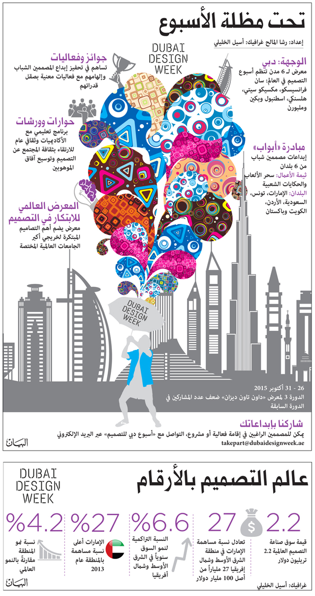 يثمر حصاد الفعاليات الكبرى التي أسست في السنوات الماضية للبنية التحتية لفن التصميم في دبي، عن إطلاق مبادرة جديدة على مستوى عالمي بأبعاد أكثر تفاعلاً مع الجمهور، وذلك من خلال «أسبوع دبي للتصميم» الذي يقام في الفترة من 26 إلى 31 أكتوبر من العام الجاري تحت رعاية سمو الشيخة لطيفة بنت محمد بن راشد آل مكتوم، نائب رئيس مجلس إدارة هيئة دبي للثقافة والفنون، والذي أعلنت عنه اللجنة المنظمة في مؤتمر صحفي أقيم صباح الأمس في مقر مجلس دبي للتصميم والأزياء بحي التصميم، والذي يندرج تحت مظلته العديد من الفعاليات وذلك وبالشراكة مع حي دبي للتصميم، ومجلس دبي للتصميم والأزياء، وهيئة دبي للثقافة والفنون ومجموعة «آرت دبي».